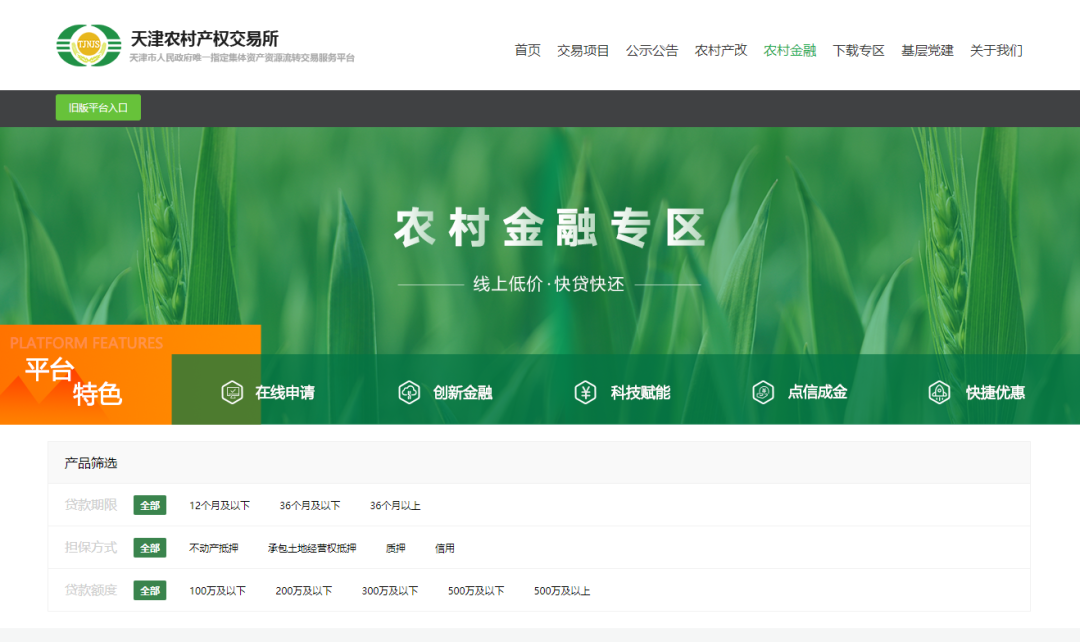 农村金融综合服务平台首批6支金融产品已开通在线申请通道,此次申请通道的开通,标志着天津农村产权交易所农村金融综合服务平台正式上线。首批发布的三家银行的共6支金融产品均面向全市农业种养殖户及合作社、家庭农场、农业企业等新型农业经营主体。申请人可登录天津农村产权交易所官方网站(www.tjnjs.com)农村金融专区进行在线申请,按照审核要求填写申请信息并上传申请资料,初审通过后,银行将安排专人对接完成后续申请流程。